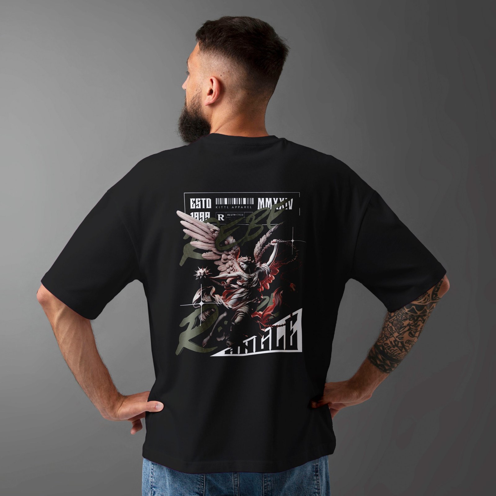 Unleash fearless street style with the Knock Originals 240 GSM Oversized T-Shirt, crafted from 100% premium cotton French terry for a soft yet structured feel. Designed for those who dare to stand out, this statement piece features a bold, artistic angel-inspired back graphic that blends mythic energy with modern urban aesthetics.