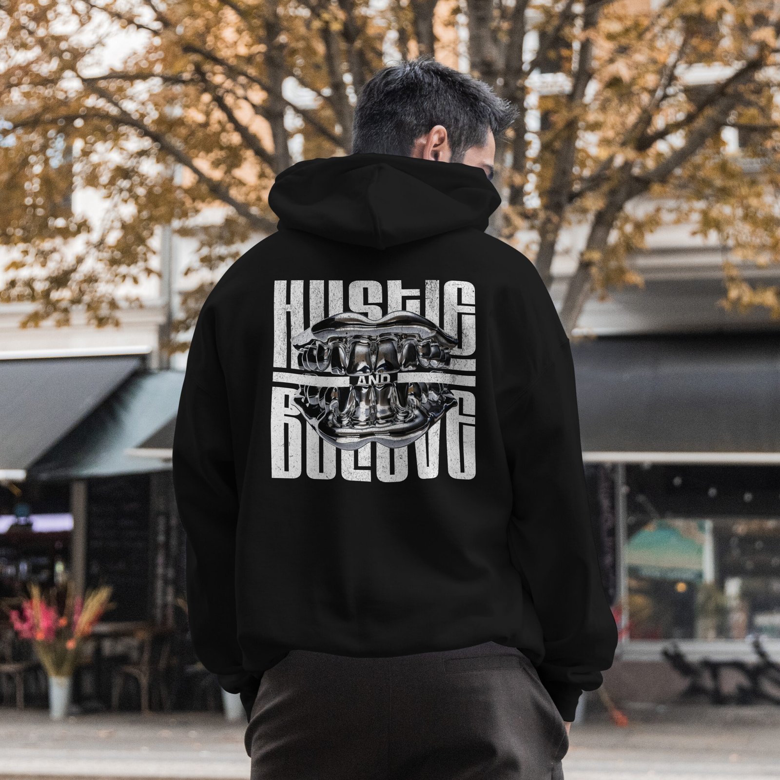 The standout graphic on the back features a striking metallic-inspired design with the words “Hustle and Believe”, symbolizing unbreakable energy and mindset. Whether you’re on the streets, in the studio, or building your empire — this hoodie reminds you to grind hard and believe harder.