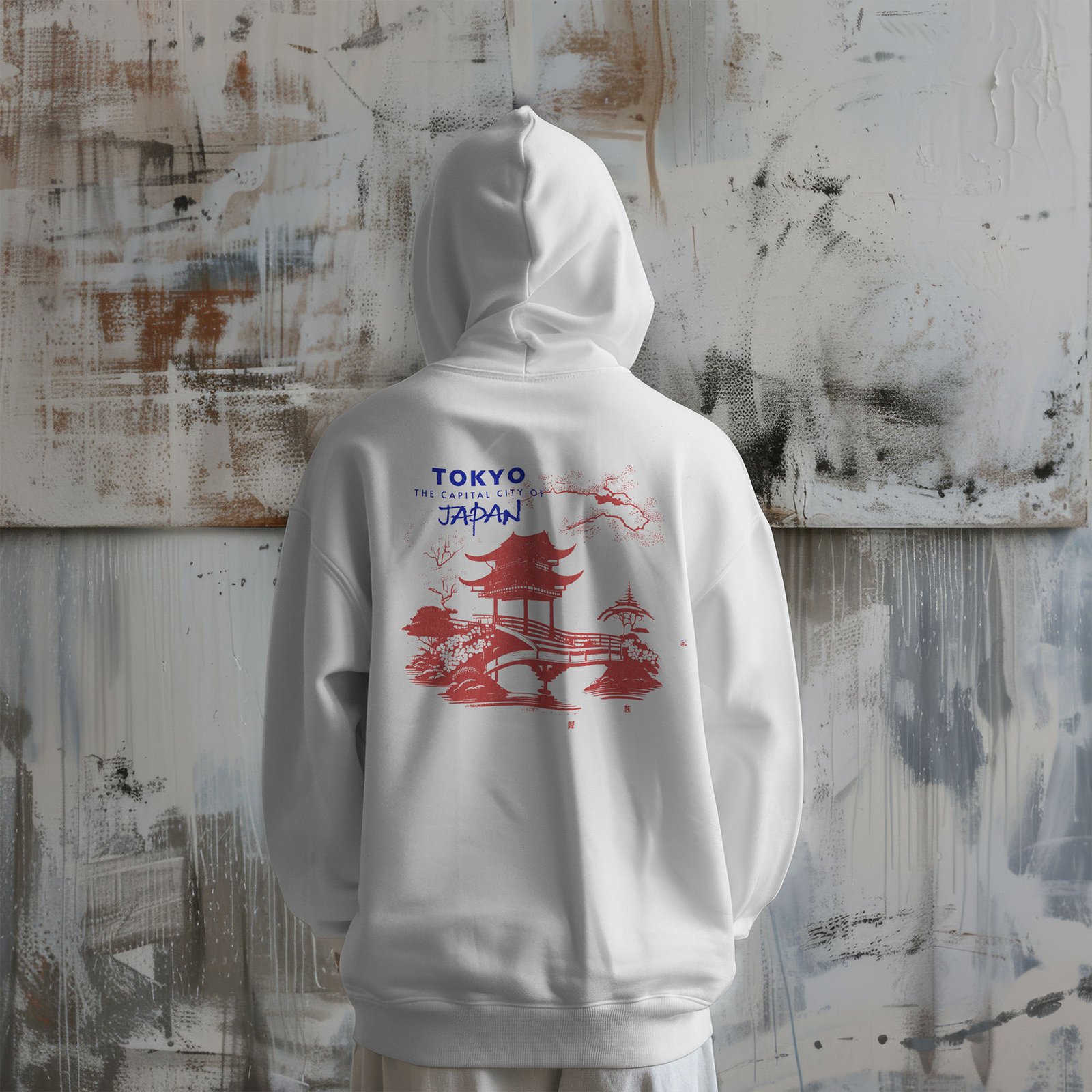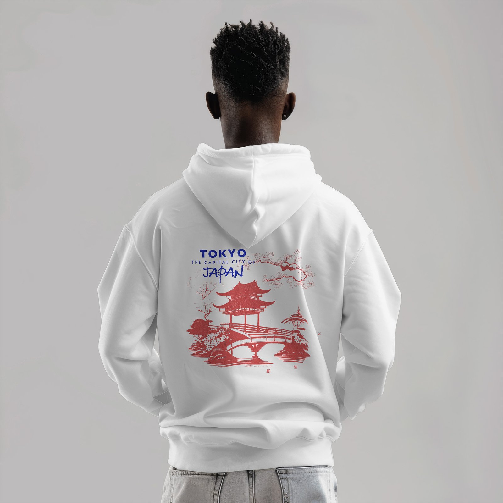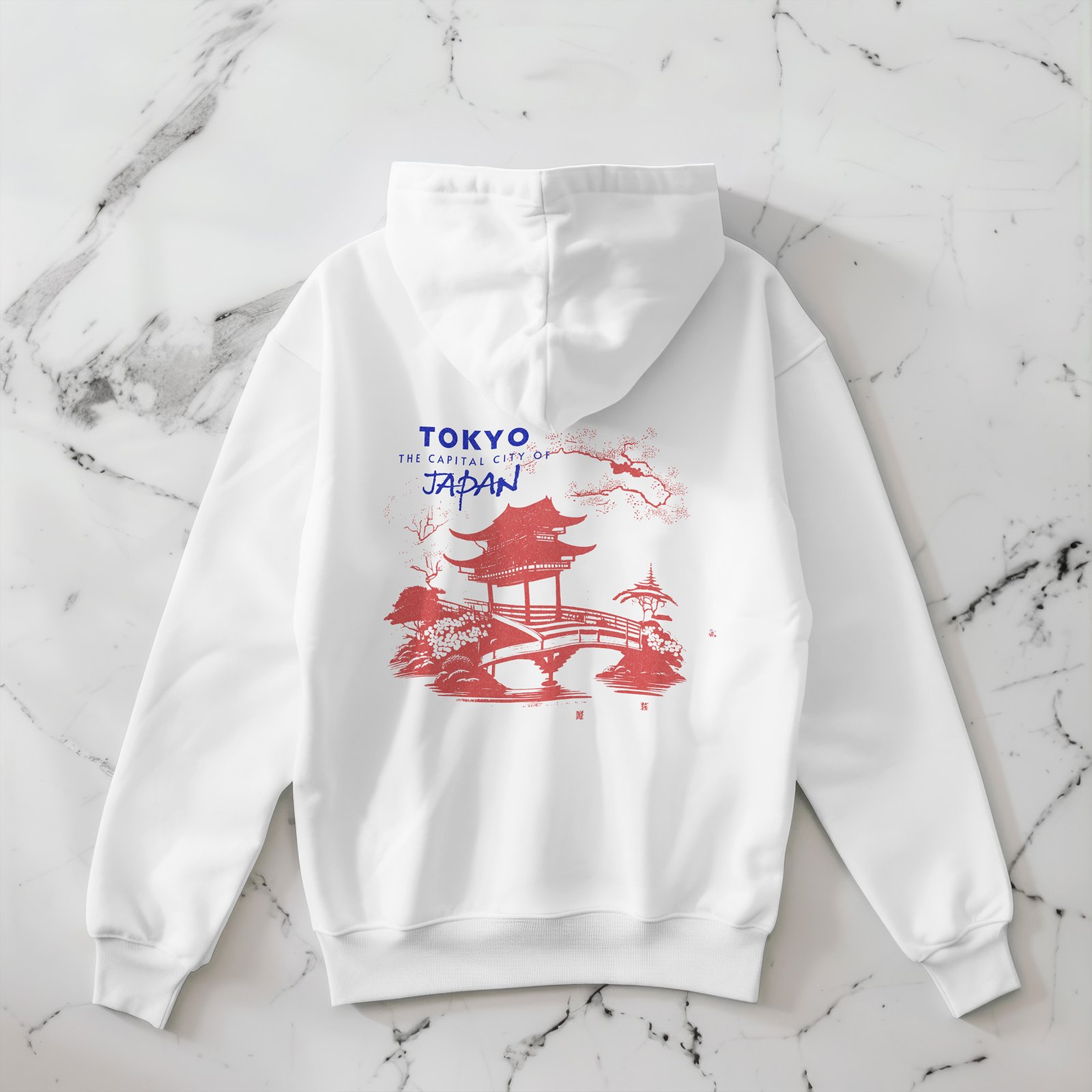Crafted from 350 GSM ultra-premium cotton, it provides exceptional warmth, durability, and a smooth, structured finish. The back showcases a beautifully illustrated Japanese pagoda and bridge in a bold red print—symbolizing serenity, tradition, and the poetic charm of Tokyo.